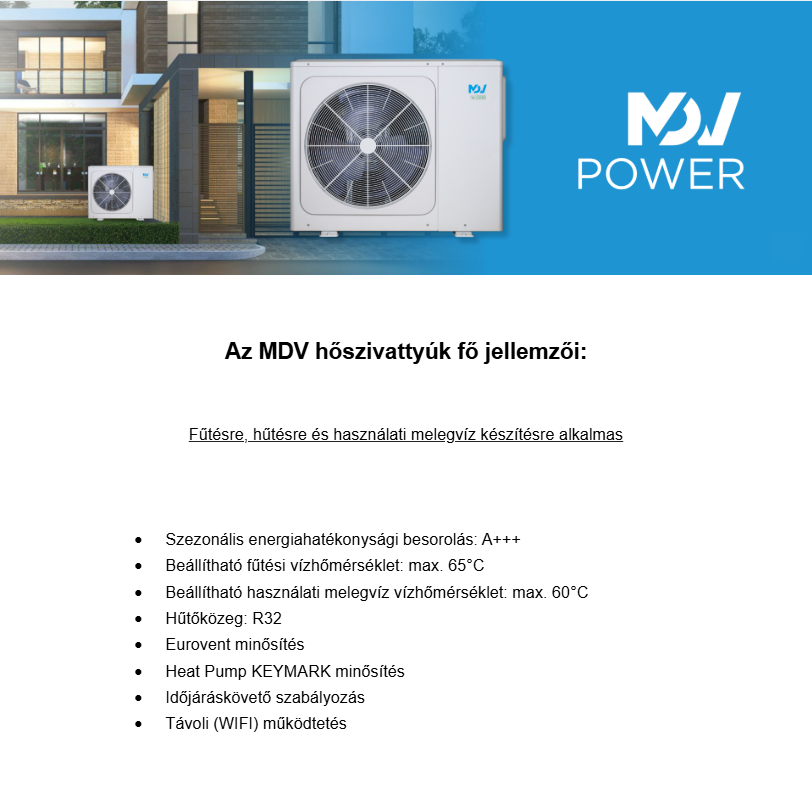 Ön éppen véleményezi: MDV MDVC-V5WD2ER8-P MDV Power monoblokkos hőszivattyú (R32, 5 kW, 1 fázis)